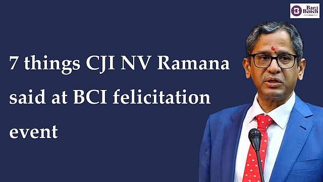 ಸುಪ್ರೀಂ ಕೋರ್ಟ್ ನ್ಯಾಯಮೂರ್ತಿಗಳು, ಕೇಂದ್ರ ಕಾನೂನು ಸಚಿವ ಕಿರೆಣ್ ರಿಜುಜು ಮತ್ತು ಅತ್ಯುನ್ನತ ಕಾನೂನು ಅಧಿಕಾರಿಗಳ ಸಮ್ಮುಖದಲ್ಲಿ ಶನಿವಾರ ಭಾರತೀಯ ವಕೀಲರ ಪರಿಷತ್ (ಬಿಸಿಐ) ಆಯೋಜಿಸಿದ್ದ ಅಭಿನಂದನಾ ಕಾರ್ಯಕ್ರಮದಲ್ಲಿ ಸುಪ್ರೀಂ ಕೋರ್ಟ್ ಮುಖ್ಯ ನ್ಯಾಯಮೂರ್ತಿ ಎನ್ ವಿ ರಮಣ ಅವರನ್ನು ಸನ್ಮಾನಿಸಲಾಯಿತು.